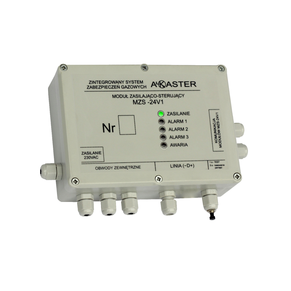 Moduły zasilająco-sterujące MZS24V1 i MZS24V1S2/S4/S8 są uproszczonymi wersjami central sterujących. Nie posiadają pełnej wizualizacji oraz podtrzymania akumulatorowego. Podobnie jak centrale, za pośrednictwem linii -D+, zapewniają zasilanie dla wszystkich elementów składowych ZSZG jednocześnie kontrolując pracę podłączonych elementów. Dodatkowo, zastosowany innowacyjny protokół transmisji danych, umożliwia łączenie elementów składowych tj. detektorów, oraz pozostałych urządzeń w układzie „topologia drzewa”, który znacznie zmniejsza ilości przewodów oraz elementów instalacyjnych. Moduły posiadają wbudowane przekaźniki przełączne, które mogą np. sterować wentylacją, odcinać napięcie zasilające itp. Moduły, podobnie jak centrale, mogą być ze sobą łączone za pośrednictwem konektorów „- WE WY” w celu zwiększenia pojemności układu (większa ilość detektorów, bądź pozostałych urządzeń systemu).